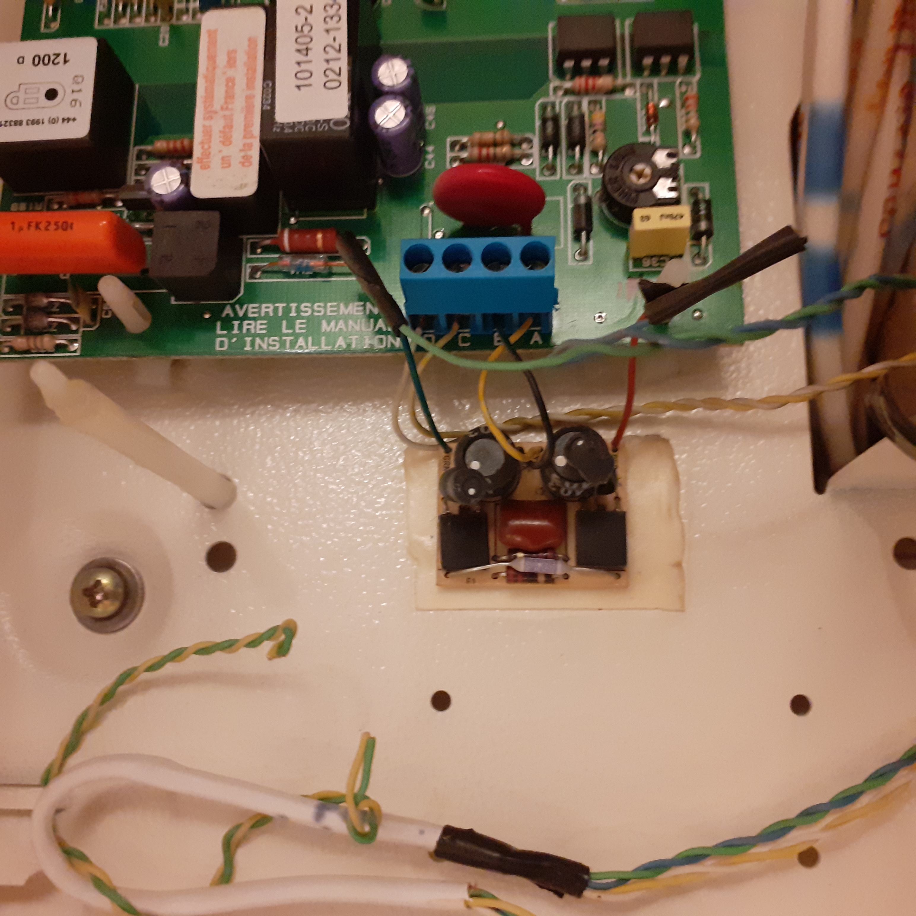 Sur une centrale Aritech CD6202 de récupération, je veux utiliser la carte transmetteur RD6202, mais je découvre un module accessoire placé à gauche de la carte ou habituellement il y a un micro.